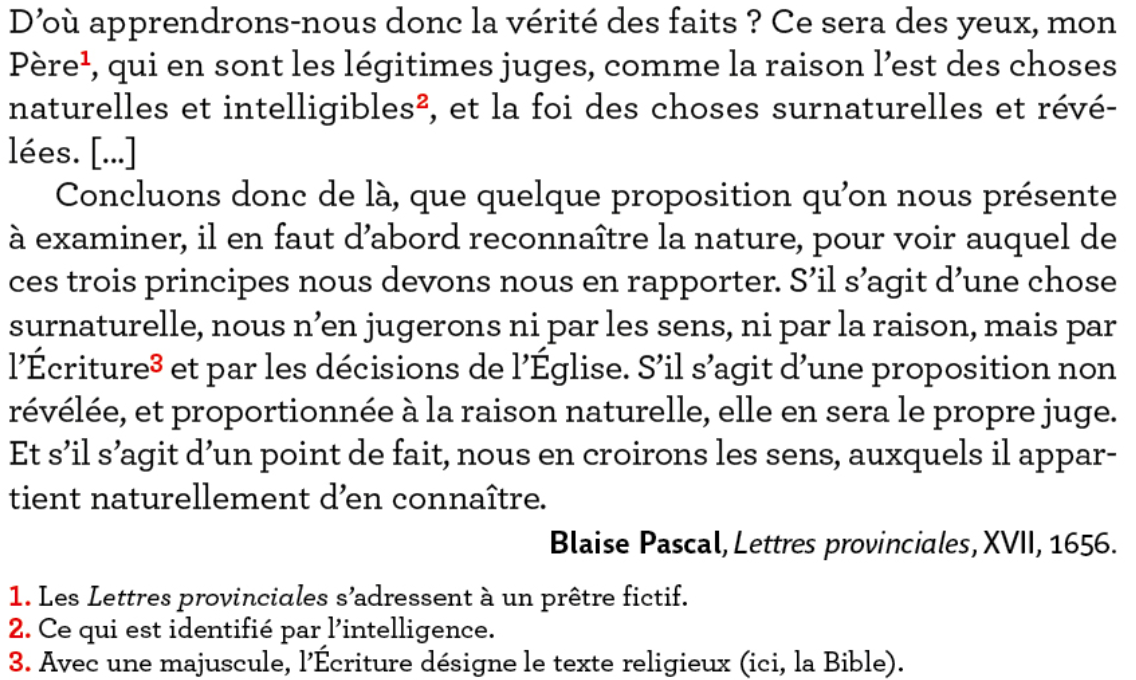 Question 1. À l’aide du texte de Blaise Pascal, reproduire sur votre cahier et remplir le tableau suivant en y introduisant les outils de connaissance dont dispose l’être humain et les objets qui leur correspondent. Utilisez les formules : Choses révélées / acceptée comme telle / L’écriture / Raison / Faits / Choses intelligibles / Sens.